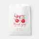 Mande os hóspedes para casa com um tratamento de na moda usando a nossa bolsa de favores "Obrigado Berry Much". Apresentando cerejas aquáticas amarradas com um arco cor-de-rosa macio e uma tipografia elegante de script, este saco personalizável é perfeito para doces, biscoitos ou pequenas coletas. Personalize com o nome do convidado de honra e a data do evento para um toque único. Coordena-se perfeitamente com a coleção completa do partido "Cherry on Top" para um tema coeso do chá de fraldas.