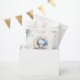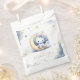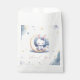 Saca de brindes super fofa com um coelhinho branco fofo usando um lindo laço azul sentado numa lua encantadora com algumas estrelas douradas caindo e algumas nuvens azuis empoeiradas.
