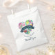 Obrigado de casamento você favorece bolsas. Personalize com seus nomes dentro uma fita azul-esverdeada sobre um coração encantador cheio de flores e folhas em cores rosa, verde e amarela. Sumério e design. Sua data de casamento no fundo e obrigado que você escreveu na fonte do rico.