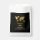 A black and gold destination wedding passport design with gold world map, airplane and travel elements. This design is ideal for all Spring, Summer, Fall and Winter destination weddings. An elegant black and gold wedding travel design with passport layout, world map and custom couple photo. A modern destination wedding favor bag design with elegant elements. Matching wedding invitations and other stationery items are also available.