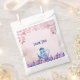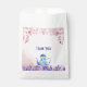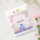 Uma bolsa de favor encantadora para colocar guloseimas para os seus hóspedes levarem para casa! Pétalas cor-de-rosa caindo em uma equipe azul e flores roxas. Um fundo rosa pálido é o pano de fundo perfeito.