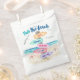 Divertido, festa de segundo aniversário do garoto de verão a favor das bolsas apresentam um sinal de praia tropical com ondas de oceano turquesa, aves marinhas, conchas de mar estreladas e tipografia "Me leve DOIS à praia" em azul-marinho aquático e náutico. Você pode personalizar o texto com seu nome, data e casal dos seus destinos favoritos de sonho (ou "Bem-vindo", "Obrigado" ou qualquer texto que você preferir). Arte por KL Stock