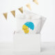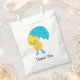 Um pequeno pato bonito com um guarda-chuva azul e o texto "Obrigado" é uma boa escolha para chás de fraldas.