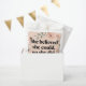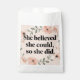 Um pôster minimalista com tipografia preta em negrito que diz 'Ela Acreditava que Consegui, Então Ela Fez', cercado por flores silvestres em aquarela em tons suaves de pêssego e sage. Exibido em uma moldura branca moderna contra sacos de favores rosa-bege