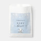 Para um chá de fraldas, comemorando um menino. Um fundo azul claro. Decorado com faíscas prateadas e um bebê elefante giro. Personalize e adicione o nome da mãe a ser.