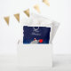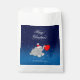 Elefante bonito com chapéu vermelho e saco com presentes de Natal sobre fundo azul com flocos de neve brancos