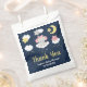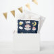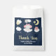 Esta bolsa de favores bonitinha e caprichosa mostra um adorável elefante bebê em um arco rosa sentado numa nuvem com estrelas caindo. Ao fundo está um céu noturno estrelado e lua crescente. O texto combina o script manuscrito e as fontes sans serif para uma aparência na moda e moderna. Isto é perfeito para um chá de fraldas.