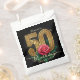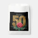 Add a touch of luxury and glamour to your milestone celebration with these elegant party favor bags. The design features a stunning contrast of a deep black background paired with ornate, faux gold foil typography for the number "50." A realistic, romantic red rose with green foliage accents the centerpiece, creating a sophisticated and classic look. These treat sacks are perfect for packaging candy, cookies, or small thank-you gifts for your guests. The template is set up for you to easily add the guest of honor's name and a personal message of gratitude. This design is ideal for a classy, floral-themed fiftieth birthday party for her.