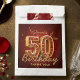 Celebrate a milestone fiftieth birthday in luxurious style with these elegant party favor bags. The glamorous design features a rich burgundy red background, sparkling gold confetti, festive ribbons, and a stunning 3D gold number 50 encrusted with ruby red gemstones. Perfect for wrapping candies, small treats, or special mementos for your guests. The text is fully editable, allowing you to easily change the name and create a memorable thank you gift for a glamorous women's 50th birthday celebration.
