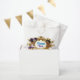 Príncipe Africano Adorável com coroa dourada, fralda branca e chinelos azuis. Linda princesa africana em Afro Puff vestindo um vestido de tutu roxo e um diamante brilhante tiara. Texto do bloco de cor púrpura e azul. Elegante quadro de ouro e texto personalizável. ©2021 Miss Sassy Party Designs
