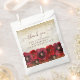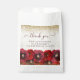 Estas bolsas florais elegantes são únicas para a embalagem de um presente para dar aos seus convidados uma festa de aniversário 75. As rosas vermelhas e o dourado falso acendem a etiqueta com um nome para personalizar. Desenhada por Susan Coffey.
