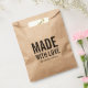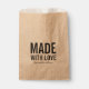 Saco kraft rústico elegante com a frase "Feito com Amor" em fonte negrito e uma escrita estilosa para o seu nome ou nome da loja em cinza escuro. É ótimo para os seus produtos artesanais ou caseiros e presentes.