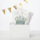 Boas bolsas com eucalipto e design verde. Incluir uma pequena mensagem de apreço aos convidados na frente. Um painel de cinzas azuis contém texto de script esbranquiçado e a mensagem de exemplo é, "Estamos tão felizes que você está aqui!". Os caules de eucalipto, folhas verdes e ranhuras de flores de lavanda constituem este design botânico perfeito para uma recepção de casamento ou pré-festa de casamento com tema natural.