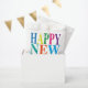 O Feliz ano novo bonito favorece as bolsas com um texto tipográfico colorido e moderno que diz Feliz ano novo, em cores azul, laranja, verde, amarelo, fúcsia, aqua e púrpura. Coordenando itens disponíveis na minha loja.