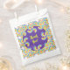 Arcos-da-chuva divertidos no círculo roxo em uma bolsa bonito de favor branca com um grande "obrigado você" amarelo.
