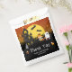 Esta bolsa de favor divertida e assustadora apresenta uma bruxa e um fantasma bonitinho ao lado de uma casa assombrada. Ao fundo está uma lua de cheio com morcegos e um céu noturno laranja com estrelas. O texto combina fontes decorativas e serif para um aspecto na moda e moderno. Isto é perfeito para uma festa de aniversário temática de Halloween.
