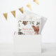 Um adorável tema de bosque para uma festa de aniversário infantil, este design apresenta uma ilustração com uma aquarela fofinha de um guaxinim na gravata vermelha de arco, uma raposa vermelha em óculos redondos e uma coruja saindo de cima. Obrigado O texto é escrito na face de tipo branco com um modelo de texto que você pode personalizar se quiser usar texto diferente.