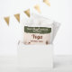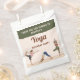 Dê um agradecimento de forma terrosa e boêmia com esta bolsa de lembrança temática de yoga desenhada pela Destei. O design apresenta um fundo bege com uma barra superior verde e espaço para uma mensagem personalizada. Três ilustrações elegantes de mulheres em yoga adicionam energia e movimento. Uma flui para a pose do dançarino, outra segura o cachorro olhando para baixo e a terceira se equilibra na pose da árvore. Cada uma usa um traje diferente em rosa e preto, azul e branco e verde e marrom, criando um toque animado e harmonioso. A paleta boho-moderna dá à bolsa um sentimento caloroso, enraizado e alegre, perfeito para adicionar um toque final consciente às celebrações de aniversário.