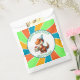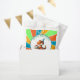 Favoritos da Festa de aniversário do Adorável Menino Personalizado. O tema do dinossauro bonito em azul, laranja e verde. Dinossauros bonitos de desenho animado segurando balões e bolo de aniversário. Adicione nome e idade na área de personalização.