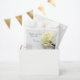Um buquê de novas flores duplas de narciso amarradas com uma fita sobre um fundo texturizado, com uma bela borboleta clara. Parte de uma suíte de casamento com muitas peças correspondentes.