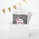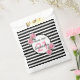 Uma bolsa de favor para uma festa elegante de aniversário de 21 anos. Listras horizontais brancas e preto clássicas como fundo. Com rosas rosadas femininas, femininas e românticas como decoração. Com o texto: Obrigado! Um quadro branco e preto na frente com modelos para idade e nome. Número de idade 21 em rosa, nome e data em preto. O nome é escrito com um script de estilo manuscrito.