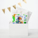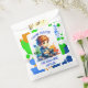 Obrigado personalizado que você favorece o bolsas. Garoto bonito tocando videos games. Fundo de tinta azul, verde e laranja.