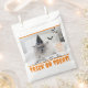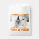 Design apresenta uma cinza assustadora gatinho peludo vestindo o chapéu de bruxa enquanto morcegos voam. O saco de tratamento diz Trick ou Treat! A mensagem diz "Feliz Dia das Bruxas da Família Syth" Clique no botão personalizar para personalizar a mensagem.