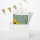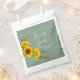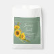 Bonito saco de favoritos de casamento apresenta buquê de girassol a cores d'água sobre fundo verde basil com blocos de texto personalizáveis brancos em fontes modernas