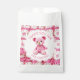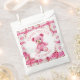 Pink and white crocheted teddy bear girl's baby shower personalized thank you for coming favor bags. An adorable pink teddy bear crocheted with pink and white yarn adds the sweetest touch.