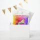 Um unicórnio com sombra de arco-íris onde você pode personalizar seu evento em um pano de fundo do arco-íris com estrelas relâmpagos e gargalhadas douradas em cima e em baixo para uma magia extra. Vibrações femininas brancas.