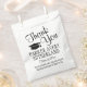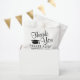 Adicione um toque elegante personalizado à graduação da faculdade ou do segundo grau, agradeço as cartas e favoritos para festas com o "obrigado você" preto e branco a favor das bolsas. Todo texto é simples de personalizar. Design apresenta um fundo branco, um boné de conselho de argamassa preta e uma tipografia do estilo de caligrafia moderna. Parabéns ao formando!