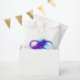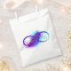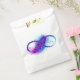 Símbolo infinito com uma bela pena pintada em cores roxas e azuis brilhantes sobre fundo branco.