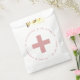Para o Kit de Emergência (também conhecido como Kit Hangover) colocar um saco de boas-vindas de casamento de destino, com algum dentro de remédio. Tem uma cruz no centro e um fazer de texto arquivado ao seu redor. Por cima, há a mensagem "Na doença e na saúde" e, por baixo, há os nomes da noiva e do noivo e a data. O texto está em pequenos bonés. O texto e a cruz são rosa empoeirados (cor-de-rosa), o fundo é branco.