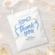 Sacos de agradecimento com laço de fita azul suave caprichoso e letra manuscrita divertida — perfeitos para qualquer festa.
