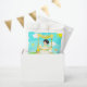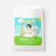 Esta bolsa de favores bonitinha e caprichosa apresenta um filho de cabelo preto com pele clara num suporte de limonada amarela que é decorado com flores e beliche. Ao fundo está um céu azul, sol e borboletas. O texto combina fontes decorativas e sans serif para um aspecto na moda e moderno. Isto é perfeito para uma festa de aniversário de verão. Gráficos de MUJKA