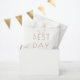 This elegant wedding favor bag design exudes a timeless and sophisticated charm with its minimalist style. The text "Best Day Ever" is presented in an inviting mix of uppercase and cursive typography, adding a touch of romance and celebration. Set against a soft white background with delicate gold accents, the color palette enhances the overall sense of joy and refinement. Perfect for commemorating special moments, this design captures the essence of love and happiness, making it ideal for weddings or other memorable events. Its clean lines and subtle elegance ensure it complements any decor while leaving a lasting impression on guests.