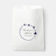 Obrigado aos seus participantes de casamento com este saco de favores brancos de tamanho amplo que apresenta um design de cor azul simples e marinho e um roteiro estilizado junto com os nomes da noiva e do noivo impressos em letras negras. Personalize seu saco de favoritos editando e substituindo nomes.