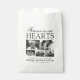 Memorial funerário favorece bolsas com 5 fotos de seu ente querido perdido, o texto "para sempre em nossos corações", o nome, datas de nascimento/morte, e uma modelo de texto que diz o que a bolsa contém. Note que estas bolsas são vendidas vazias, você precisará preenchê-las com seus próprios favores.