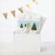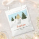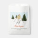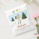 Celebre um aniversário de esqui com estilo com este design, ilustrado pela Destei. Com uma ilustração em aquarela de uma menina descendo as encostas nevadas com árvores de abeto verdes sob um céu de inverno azul claro com neve caindo, o design é festivo e divertido. A bolsa de favores inclui espaço para uma mensagem personalizada de agradecimento, tornando-a um toque final perfeito para favores de festa, guloseimas ou presentes das encostas.