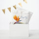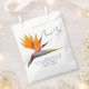 Casamento em massa favorece bolsas com pássaro laranja de design. Personalizar bolsas brancas (aproximadamente 5x8 polegadas, em pacotes de 50 bolsas) com uma mensagem de apreço para convidados de casamento. Grandes flores havaianas design com texto impresso azul escuro. A mensagem de exemplo é, "Estamos muito gratos por você estar aqui hoje para compartilhar nossa alegria. Amor e obrigados, (nomes)"