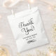 As bolsas favoritas de casamento apresentam um escrevendo decorativo de cor preta "Obrigado" com design com design de monograma personalizado que inclui os nomes da noiva e do noivo e a data do casamento.