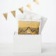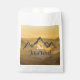 Monograma Dourado de montanhas personalizável. Montanhas desenhadas pelo vetor em cor azul de cinza com um monograma personalizável e seu nome. Ao fundo, um espantoso nascer do sol dourado com nevoeiro no vale e raios solares. presente de excelente de alguém que ama montanhas.