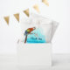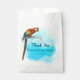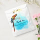 Um papagaio vintage por D'Orbigny em um splash de aquarela turquesa para o seu saco de favor de chuveiro de noiva. O texto é azul-turquesa.