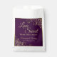 Estas lindas bolsas de lembrança são simples, elegantes e bonitas. Elas apresentam um design clássico e sofisticado com letras em escrita dourada elegante e laços e espirais de renda dourada em um fundo roxo profundo. O texto diz: O Amor é Doce, Por favor, pegue um presente! Há espaço para seus nomes e a data do casamento abaixo. Maneira maravilhosa e atenciosa de agradecer aos convidados por celebrarem com você.