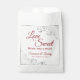 Estas belas bolsas de favores são simples, elegantes e bonitas. Eles apresentam uma design de classe e na moda com elegante cartaz vermelho e cinza prateada com caracóis e espirais nos cantos. O texto diz: "O amor é doce, por favor, dê uma olhada! Há espaço para seus nomes e a data do casamento abaixo. Uma maneira maravilhosa e pensativa de obrigado aos seus convidados por celebrarem contigo.