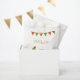 Festa e diversão do aniversário do Cactus. Bandeiras vermelhas e verdes, e um cacto sorridente como decoração. Cores vermelho e verde. Cor de fundo branca. Com o texto: Fiesta e Diversão e Obrigado! Modelo para um nome.