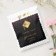 Para uma celebração moderna e moderna de graduação. Um fundo preto chic com confete rosa e roxo. Texto: Obrigado! O texto: Formando é escrito com um script de estilo, letras de ouro, com letras grandes. Modelo de nome e ano. Decorado com um boné moderno, abstrato, chapéu, tassel em ouro falso com o dentro de ano.