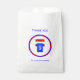 Uma bolsa de favorecimento divertida e colorida da 9ª festa de aniversário pronta para seu texto personalizado, que atualmente lê (em azul) "OBRIGADO" "por vir para minha festa". O design apresenta um grande banner vermelho de aniversário com a mensagem "HAPPY BIRTHDAY". Embaixo, há uma camiseta esportiva azul e vermelha, com um grande número branco 9 e espaço para o nome da criança de aniversário. Isto tem um fundo de estrelas azuis espalhadas e está aninhado em vermelho e azul.