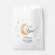 Estas obrigados que você favorece às bolsas têm o tema do chá de fraldas "Sobre a Lua" com lua dourada e estrelas em texto negro. Personalize facilmente com nome e data. Excelente de segurar guloseimas para seus convidados ou de ter pequenos prêmios para ganhar jogos de chá de fraldas.