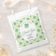 A charming St. Patrick’s Day baby shower favor bag featuring a soft green background, golden horseshoes, and scattered four‑leaf clovers for a sweet “lucky charm” theme. The central white oval frames the event details beautifully, creating a warm, welcoming design perfect for celebrating a growing family. Ideal for March celebrations, Irish‑inspired themes, or any baby shower that embraces luck, joy, and new beginnings.